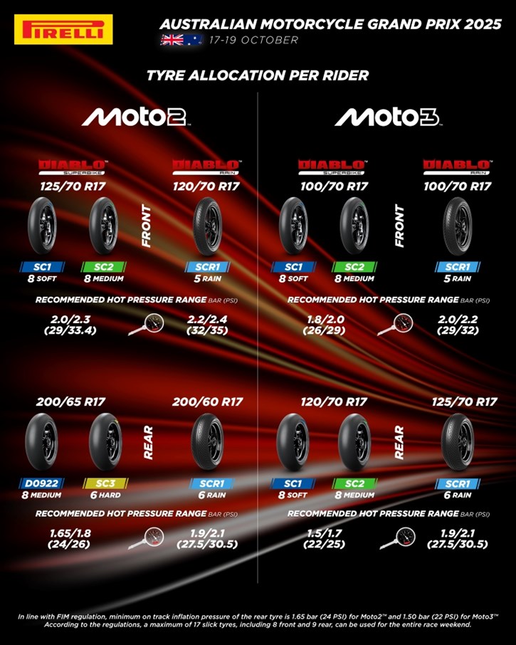 Για να αντιμετωπίσει την απαιτητική πίστα του Phillip Island, η Pirelli θα έχει διαθέσιμα για τη Moto2™ το ελαστικό ανάπτυξης προδιαγραφής D0922 και το στάνταρ σκληρό SC3 για τον πίσω τροχό.