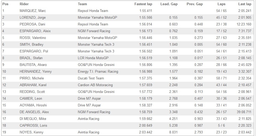 Το τεστ ολοκληρώθηκε στην πίστα του Brno, παρά το ότι δυο ώρες περίπου πριν από το τέλος η βροχή ξεκίνησε να πέφτει στην τσέχικη πίστα. Στους χρόνους, ο Marc Marquez ανέκαμψε και σημείωσε τον καλύτερο χρόνο της ημέρας, καθώς μόνον αυτός και ο Lorenzo έπεσαν κάτω από το 1:56.