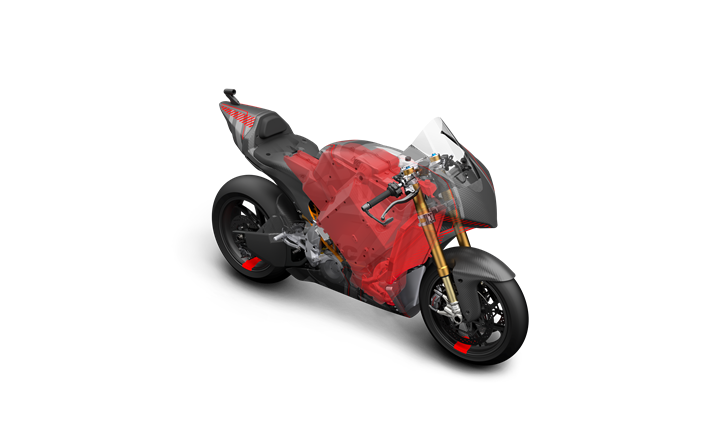 Η θήκη από ανθρακόνημα που περιέχει την μπαταρία λειτουργεί και ως ενεργό μέρος του πλαισίου, όπως ακριβώς συμβαίνει και στον κινητήρα της Ducati Panigale V4, με το εμπρός αλουμινένιο monocoque πλαίσιο να ζυγίζει μόλις 3,7 κιλά.