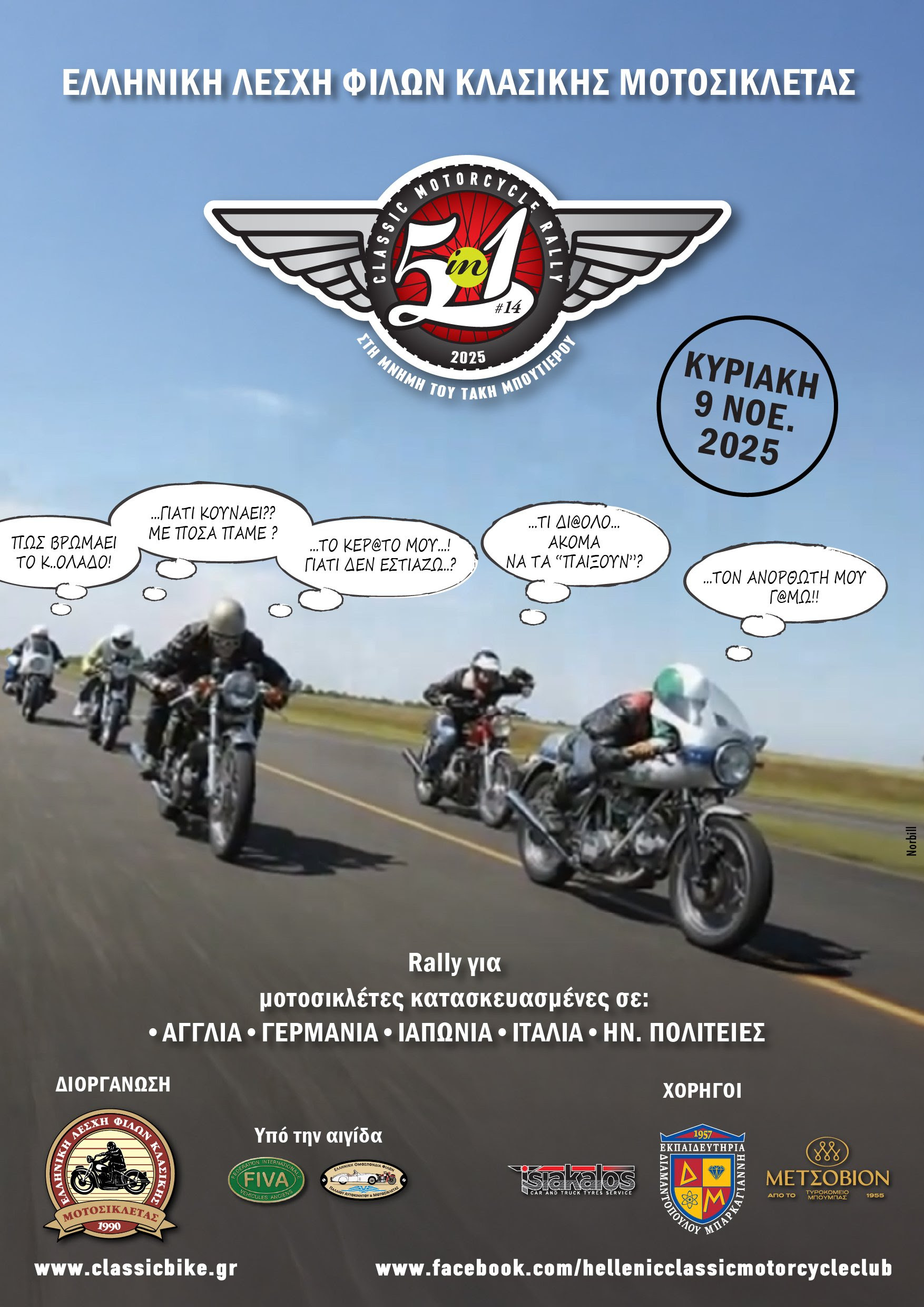 Οι 5 μεγάλες δυνάμεις της Κλασικής Μοτοσικλέτας - Γερμανία, Αμερική, Ιαπωνία, Ιταλία, Αγγλία - ετοιμάζονται για την κατάκτηση του μεγάλου Τροπαίου σε ένα ράλι περίπου 115 χλμ με 2 ειδικές διαδρομές.