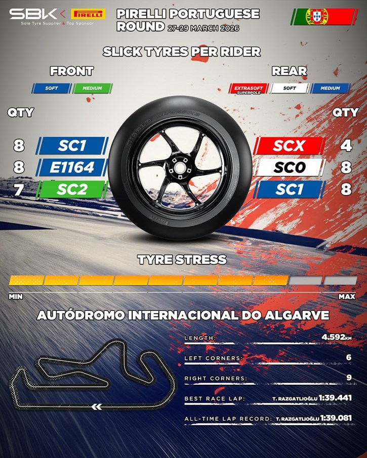 - Η Sportbike κάνει το ντεμπούτο της. Το νέο Παγκόσμιο Πρωτάθλημα FIM Sportbike κάνει επίσης το ντεμπούτο του στην πορτογαλική πίστα. Αυτή η κατηγορία αντικαθιστά την κατηγορία Supersport300 και περιλαμβάνει έξι κατασκευαστές με μοτοσυκλέτες που διαφέρουν σημαντικά ως προς τη διαμόρφωση του κινητήρα και την ισχύ. Αυτό που έχουν κοινό θα είναι τα ίδια ελαστικά για όλους: Σύνθεση Pirelli DIABLO Superbike SC1 για εμπρός και πίσω, σε διαστάσεις 120/70 μπροστά και 180/60 πίσω — η ίδια που χρησιμοποιείται ήδη στο Παγκόσμιο Πρωτάθλημα WRC FIM, το οποίο εισέρχεται τώρα στην τρίτη σεζόν του.