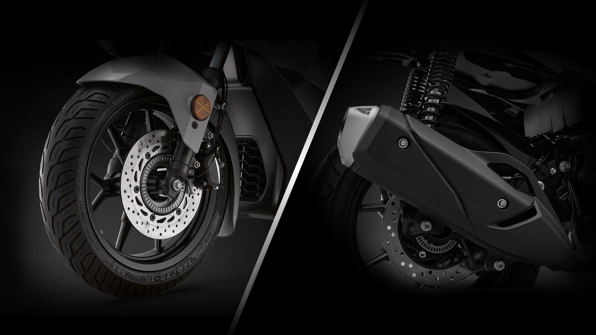 Το νέο μοντέλο διαθέτει κορυφαίο πακέτο ασφαλείας. Ο μπροστινός τροχός φέρει δίσκο 256 mm με δισπίστονη δαγκάνα, ενώ ο πίσω τροχός δίσκο 240 mm με δαγκάνα Ø34, χαρίζοντας ισχυρή και προοδευτική πέδηση. Το δικάναλο ABS επεμβαίνει διακριτικά, διατηρώντας τον έλεγχο ακόμη και σε συνθήκες χαμηλής πρόσφυσης.