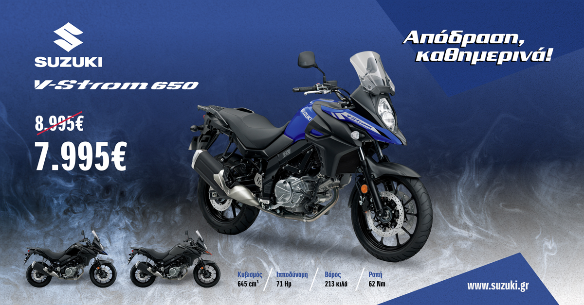 Απόκτησε τώρα τη νέα σου Suzuki V-STROM 650 με όφελος 1.000€ και νέα προτεινόμενη τιμή λιανικής 7.995€.