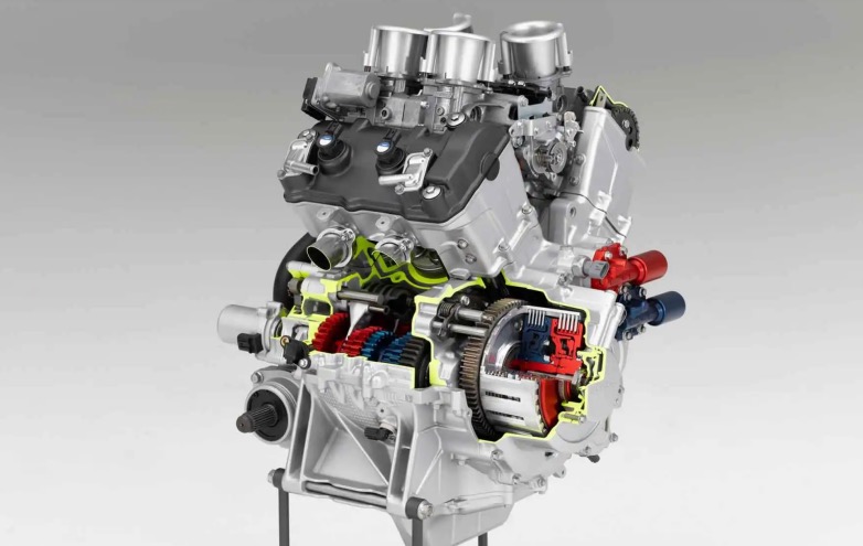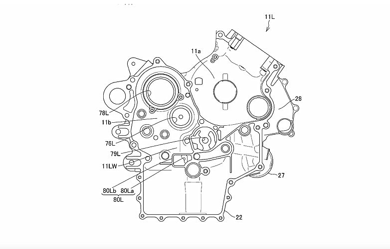 Αντίστοιχα, ο νέος V4 στις απεικονίσεις φαίνεται πολύ πιο συμπαγής. Ιδίως το ενιαίο κέλυφος κινητήρα–κιβωτίου δείχνει εντυπωσιακά μικρό. Ίσως αυτό να οφείλεται στο νέο σύστημα λίπανσης, με λιγότερες μακριές σωληνώσεις μέσα στο κάρτερ, καθώς η Honda σκοπεύει να βελτιστοποιήσει τη λίπανση του συμπλέκτη και της αντλίας νερού μέσω μικρών βοηθητικών δεξαμενών λαδιού μέσα στο κάρτερ.
