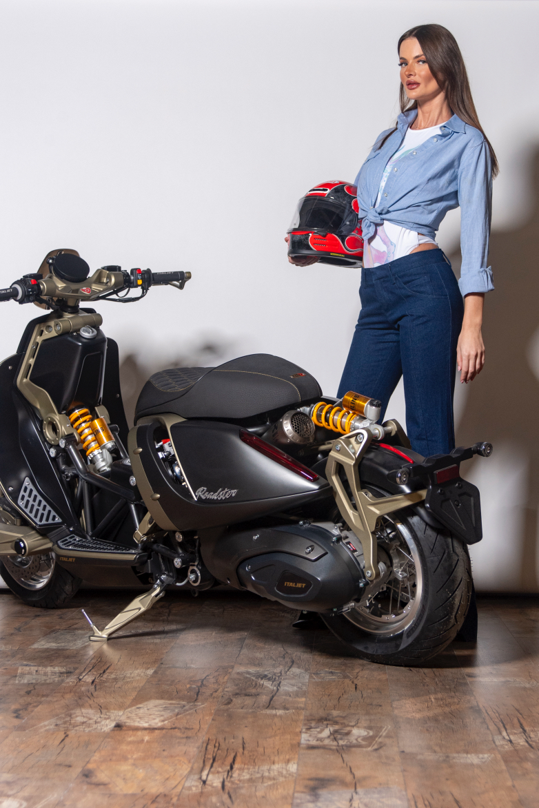 Η βροχερή Ίμολα με τη χαμηλή χειμωνιάτικη θερμοκρασία δεν ήταν ό,τι καλύτερο, μέχρι που η ζεστασιά του κεντρικού χώρου των γραφείων της Italjet μας επιφύλαξε μια ωραία υποδοχή. Πέρα από τον καλό Ιταλικό καφέ η θερμοκρασία ανέβηκε καθώς ο εκδότης του Ιταλικού περιοδικού Mode e Motori Magazine, o Giuseppe Piazzolla σε ρόλο φωτογράφου, καθοδηγούσε την Andra Rollins που πόζαρε με νάζι και σχεδόν αισθαντικά πάνω στην Dragster Roadster, το πιο πρόσφατο εντελώς νέο δημιούργημα του Ιταλού κατασκευαστή.