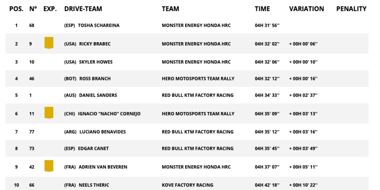Επίσης από τις ΗΠΑ ο Skyler Howes, μόλις 10 δευτερόλεπτα πιο πίσω, διαμόρφωσε το 1-2-3 για την Honda, υπογραμμίζοντας τη δύναμη του Ιάπωνα κατασκευαστή. Στον αντίποδα, ο συναθλητής τους Adrien Van Beveren έχασε ακόμη 5 λεπτά και πλέον βρίσκεται στο όριο της πρώτης δεκάδας, με συνολική διαφορά 27’24’’ από τον Schareina.