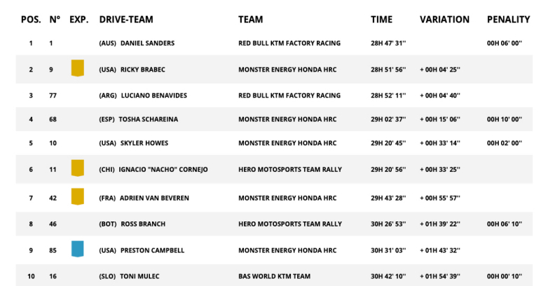 Η πρώτη τριάδα της γενικής κατάταξης παραμένει η ίδια, με τον Daniel Sanders στην κορυφή, ωστόσο η 4η θέση του σήμερα τον φέρνει σε μειονεκτική θέση για το αυριανό σκέλος σε σχέση με τον άμεσο διώκτη του, Ricky Brabec (+4′25″), ο οποίος θα εκκινήσει στο επόμενο σκέλος από τη δέκατη θέση, 21 λεπτά μετά τον Αυστραλό. Ο αναβάτης της Monster Energy Honda HRC φημίζεται για τη στρατηγική του αντίληψη και μπορεί να εκμεταλλευτεί την κατάσταση.