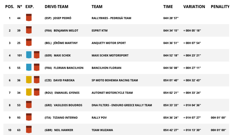 Στην κατηγορία Original by Motul, στην οποία διαγωνίζεται ο Βασίλης Μπούδρος προηγείται ο Γάλλος Benjamin Melot με ΚΤΜ στη γενική κατάταξη της κατηγορίας, όμως η διαφορά του από τον Josep Pedro με Husqvarna μειώθηκα στα 2'50'', μετά τη σημερινή νίκη του Ισπανού.
