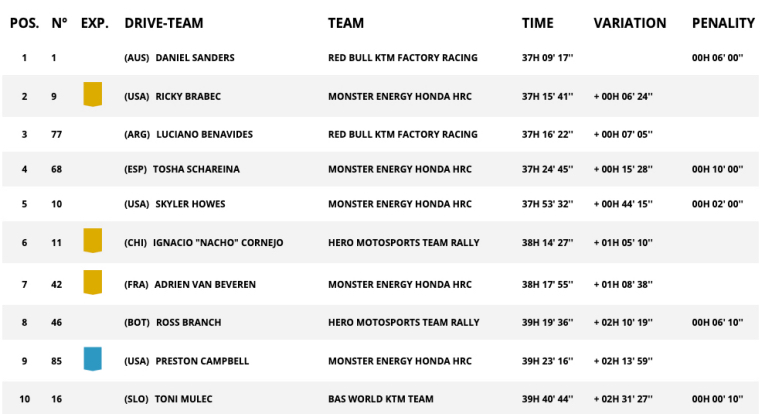 Έτσι, ο Αυστραλός αναβάτης της KTM ανέκτησε την πρωτοπορία στη Γενική Κατάταξη, όπου πλέον προηγείται με διαφορά 6’24’’ από τον Αμερικανό αντίπαλό του Ricky Brabec. Ωστόσο, αυτό το προβάδισμα δεν θεωρείται ιδιαίτερα άνετο ενόψει του δεύτερου σκέλους του μαραθωνίου–refuge, στο οποίο ο αναβάτης της Honda θα εκκινήσει μόλις τρία λεπτά πίσω του και όπου η διαδρομή, με τις απαιτητικές αμμοθίνες, μπορεί να κρύβει νέες εκπλήξεις.