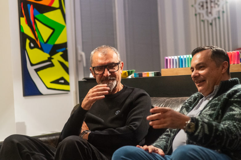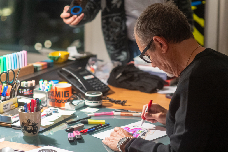 Η συζήτηση στράφηκε στο τρόπο που εργάζεται και στο γεγονός ότι είναι από τους λίγους ανθρώπους στο κόσμο πλέον που επιμένει να σχεδιάζει χωρίς υπολογιστή. Τα έργα του είναι φτιαγμένα από το 0. Από μια απλή κόλλα χαρτί. Δεν ανοίγει ποτέ υπολογιστή ώστε να εργαστεί, πιστεύει πως σου κλέβει όλη την φαντασία και τη δημιουργικότητα. Για αυτό πάνω στο γραφείο του βλέπουμε μόνο μαρκαδόρους, χαρτιά, μολύβια και σχέδια.