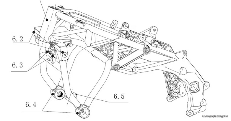 Το σύνθετο πλαίσιο από χαλύβδινο χωροδικτύωμα και αλουμινένια στοιχεία που απεικονίζεται στην πατέντα της Zongshen αντιστοιχεί σε μεγάλο βαθμό – με εξαίρεση τις προσαρμογές που αφορούν τη διεύθυνση μέσω πλήμνης – σε εκείνο της Cyclone RA 1000. Αυτή η γυμνή μοτοσυκλέτα, μαζί με τον V2 κινητήρα της, βασίζεται τεχνικά στη συνεργασία με την Piaggio και προέρχεται από την Aprilia Shiver 900. Στο πίσω μέρος, η Cyclone RA 1000 διαθέτει ήδη μονόμπρατσο ψαλίδι και θα μπορούσε να ακολουθήσει μια νέα έκδοση και με μονόμπρατσο ψαλίδι εμπρός.