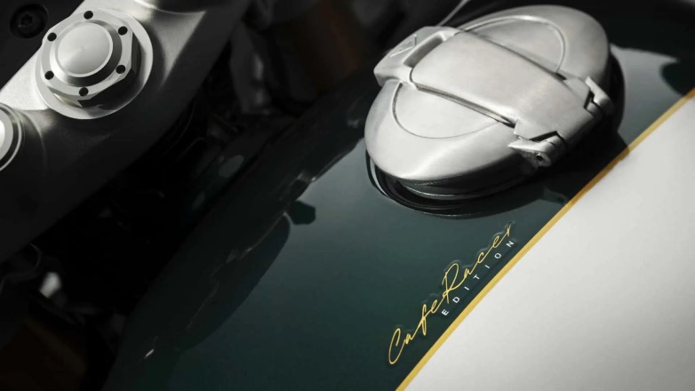 Σύμφωνα με την Triumph, η νέα Cafe Racer Edition είναι “τέχνη εν κινήσει”, κάτι που φαίνεται απλώς κοιτώντας τις φωτογραφίες, οπότε σίγουρα θα είναι ακόμη πιο εντυπωσιακή από κοντά, ειδικά όταν κινείται. Η εξωτερική εμφάνιση περιλαμβάνει χαμηλά τιμόνια clip-on, ένα νέο πίσω κάλυμμα που κρύβει τη σέλα του συνεπιβάτη και πιο αεροδυναμικό σχήμα. Υπάρχουν επίσης καθρέφτες στα άκρα του τιμονιού, αποκλειστικός χρωματισμός Competition Green και Aluminium Silver, πινελιές από γυαλιστερό αλουμίνιο παντού, το γραφικό νούμερο “12” στα πλαϊνά και μια χρυσή γραμμή Empire Gold που διατρέχει τη μοτοσυκλέτα, χωρίζοντας τα χρώματα. Για όσους θέλουν να κινούνται και με συνεπιβάτη, η Triumph αναφέρει ότι τα σχετικά εξαρτήματα θα περιλαμβάνονται στο κιβώτιο παραλαβής, ώστε οι ιδιοκτήτες να μπορούν να αντικαταστήσουν το πίσω μέρος της σέλας όποτε το επιθυμούν.