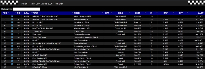 Ο Yari Montella (Barni Spark Racing Team) εκμεταλλεύτηκε επίσης τη δοκιμή για να γράψει σταθερά χιλιόμετρα με την Ducati Panigale V4 R, σημειώνοντας καλύτερο χρόνο 2’04.442, δίνοντας έμφαση στις ρυθμίσεις και όχι στην απόλυτη επίδοση.