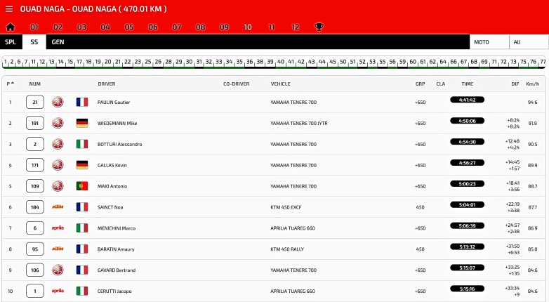 Ο πρώην αναβάτης MXGP Paulin, που συμμετέχει στο πρώτο του AER στην κατηγορία μοτοσυκλετών μετά τη νίκη του στην έκδοση του 2024 στην κατηγορία αυτοκινήτων, πραγματοποίησε μέχρι στιγμής την κορυφαία εμφάνιση του ράλι, κατακτώντας μια εντυπωσιακή νίκη με την Ténéré 700 Rally. Η διαφορά νίκης του 35χρονου ήταν 8 λεπτά και 24 δευτερόλεπτα, γεγονός που τον έφερε από την 3η θέση στην κορυφή της γενικής κατάταξης. Αυτό σημαίνει ότι προηγείται με διαφορά ενός λεπτού και 25 δευτερολέπτων, με μόλις μία χρονομετρημένη Ειδική 102 χλμ. να απομένει και να μετρά στο τελικό αποτέλεσμα.