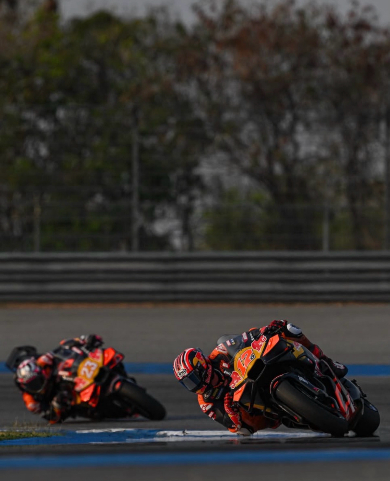 Ο Jorge Martin με τη δική του Aprilia δεν έκανε προσομοίωση αγώνα, αλλά προσπάθησε να κάνει πολλούς συνεχόμενους γύρους για να είναι πιο έτοιμος για το επόμενο ΣΚ. 5ος το απόγευμα και 8ος στα συνδυασμένα δείχνει ότι η Ιταλική μοτοσυκλέτα είναι η μόνη πραγματική απειλή για την Ducati στην Ταϊλάνδη, αφού η ΚΤΜ, πατά την 6η θέση του Pedro Acosta στα συνδυασμένα αποτελέσματα, έχει ακόμη αρκετή δουλειά να κάνει στην εξέλιξη και τις ρυθμίσεις της μοτοσυκλέτας, για να έχει καλό ρυθμό σε όλη τη διάρκεια του αγώνα.