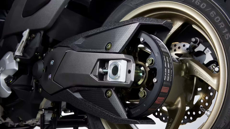 Η μετάδοση είναι CVT, όπως αναμενόταν, αλλά σε συνδυασμό με τελική μετάδοση με ιμάντα και αλουμινένιο ψαλίδι για να έχει μικρότερη μη αναρτώμενη μάζα στον πίσω τροχό. Το πίσω ελαστικό είναι φαρδύ σε διάσταση 160, δηλαδή ουσιαστικά προδιαγραφών μοτοσυκλέτας. Με άλλα λόγια, απλότητα στους χειρισμούς αλλά με εξοπλισμό που μπορεί να ακολουθήσει κανονικές μοτοσυκλέτες σε ταξίδι.