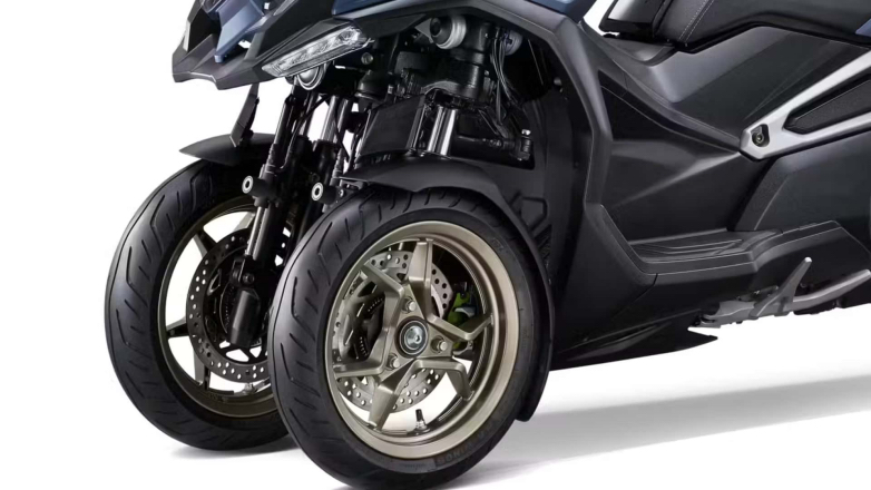 Μπροστά, υπάρχει το σύστημα με δύο τροχούς της Kymco. Οι τροχοί είναι 13 ιντσών, υπάρχει ανεξάρτητη ανάρτηση και μηχανισμός σύνδεσης παραλληλογράμμου που επιτρέπει κλίση μέχρι περίπου 40 μοίρες. Κάνει κάτι παρόμοιο με το τρίτροχο Yamaha Niken, αλλά σε πιο προσιτή σκούτερ εκδοχή. Σε σύγκριση με το Piaggio MP3, αυτό μοιάζει πιο επιθετικό και προσανατολισμένο στις επιδόσεις.