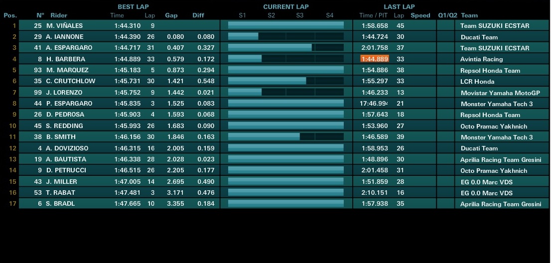 Η Suzuki έχει δυο αναβάτες της στην πρώτη τετράδα, με τον Aleix Espargaro να είναι στο 1:44,7 τέσσερα δέκατα πιο αργός από τον ομόσταυλό του.