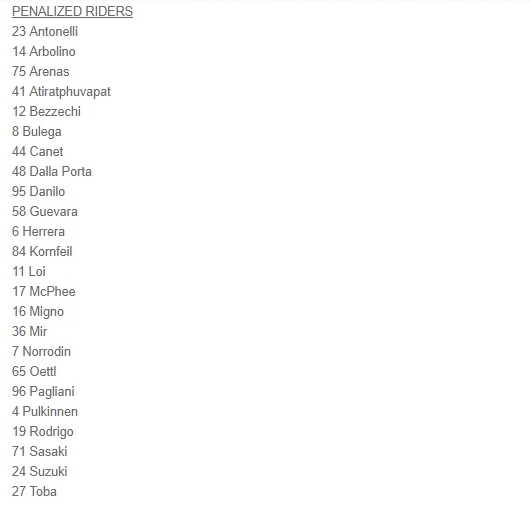 Αυτή τη φορά επέλεξαν να τιμωρήσουν 24 αναβάτες της κατηγορίας από τους 33 που έδωσαν το παρόν στο Grand Prix της Τσεχίας, μιας και είχαμε και δυο οδηγούς να κάνουν έκτακτη συμμετοχή.