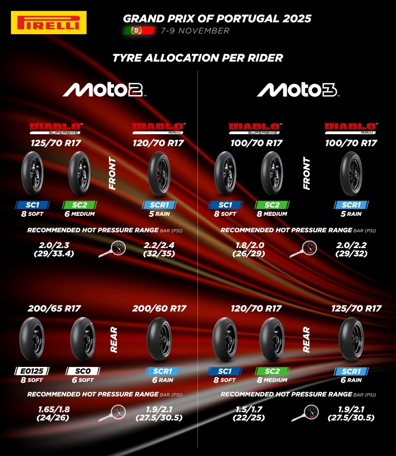 • Για το Grand Prix της Πορτογαλίας 2025, οι αναβάτες της Moto2™ θα έχουν στη διάθεσή τους δύο πίσω ελαστικά, και τα δύο σε μαλακή γόμα: το στάνταρ SC0 και το ελαστικό ανάπτυξης προδιαγραφής E0125, το οποίο χρησιμοποιεί την ίδια γόμα με το στάνταρ ελαστικό, αλλά σε μια πιο προηγμένη δομή ελαστικού. Η τελευταία επιλογή έχει ήδη εφαρμοστεί σε 9 GP φέτος και, σε επτά περιπτώσεις, ήταν παρούσα στην κατανομή με το στάνταρ SC0, κερδίζοντας πάντα στην άμεση σύγκριση μεταξύ των δύο.