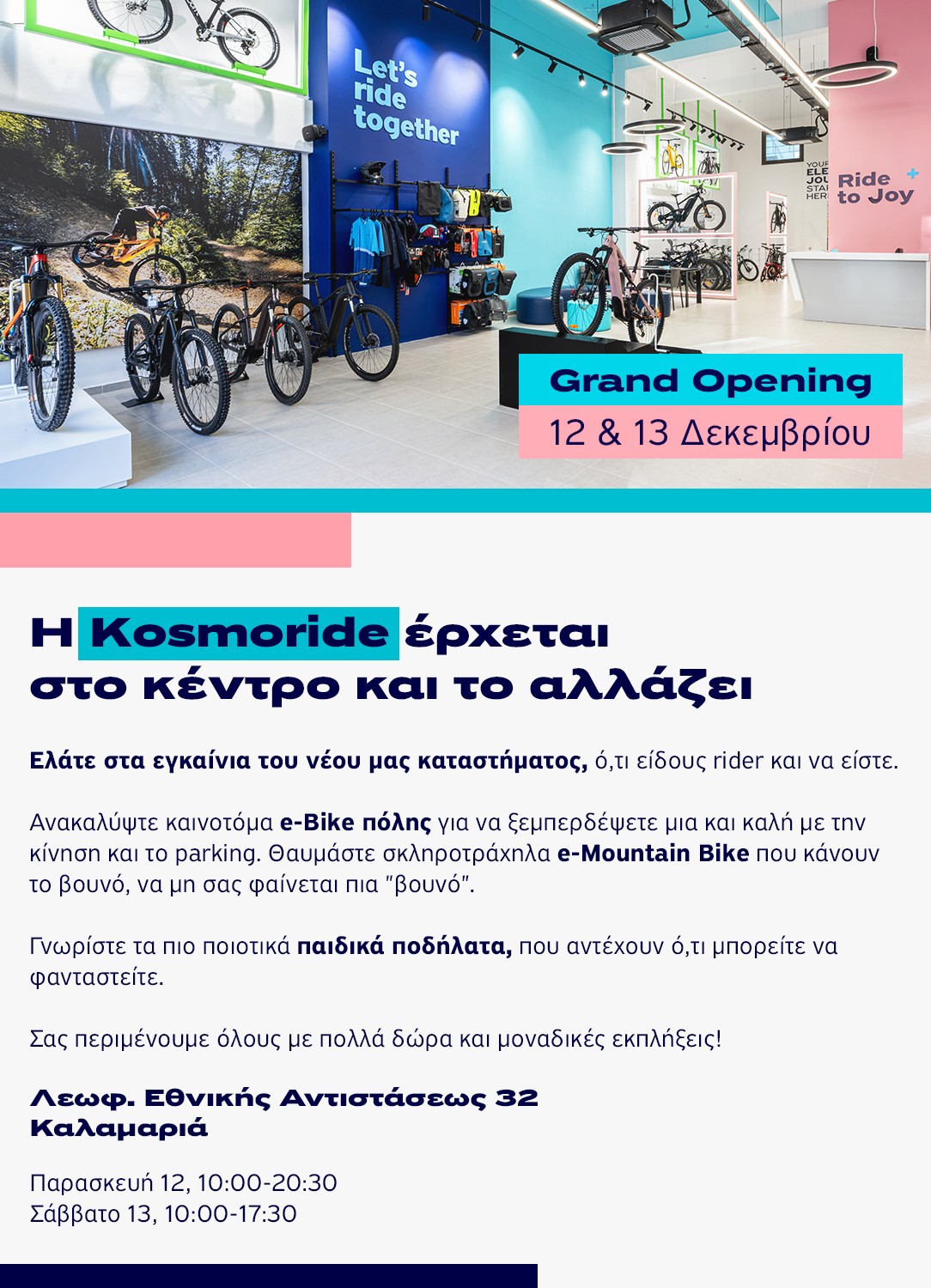 Με το νέο της κατάστημα στην Καλαμαριά, η Kosmoride ενισχύει την παρουσία της στη Θεσσαλονίκη και καθιστά την εμπειρία της ηλεκτρικής ποδηλασίας ακόμη πιο προσιτή στην καθημερινότητα της πόλης.