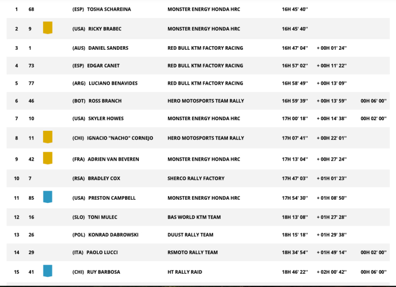 Επίσης από τις ΗΠΑ ο Skyler Howes, μόλις 10 δευτερόλεπτα πιο πίσω, διαμόρφωσε το 1-2-3 για την Honda, υπογραμμίζοντας τη δύναμη του Ιάπωνα κατασκευαστή. Στον αντίποδα, ο συναθλητής τους Adrien Van Beveren έχασε ακόμη 5 λεπτά και πλέον βρίσκεται στο όριο της πρώτης δεκάδας, με συνολική διαφορά 27’24’’ από τον Schareina.
