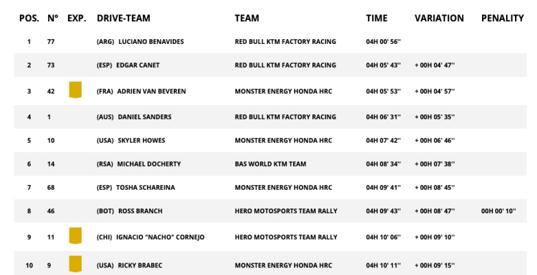 Η πρώτη τριάδα της γενικής κατάταξης παραμένει η ίδια, με τον Daniel Sanders στην κορυφή, ωστόσο η 4η θέση του σήμερα τον φέρνει σε μειονεκτική θέση για το αυριανό σκέλος σε σχέση με τον άμεσο διώκτη του, Ricky Brabec (+4′25″), ο οποίος θα εκκινήσει στο επόμενο σκέλος από τη δέκατη θέση, 21 λεπτά μετά τον Αυστραλό. Ο αναβάτης της Monster Energy Honda HRC φημίζεται για τη στρατηγική του αντίληψη και μπορεί να εκμεταλλευτεί την κατάσταση.
