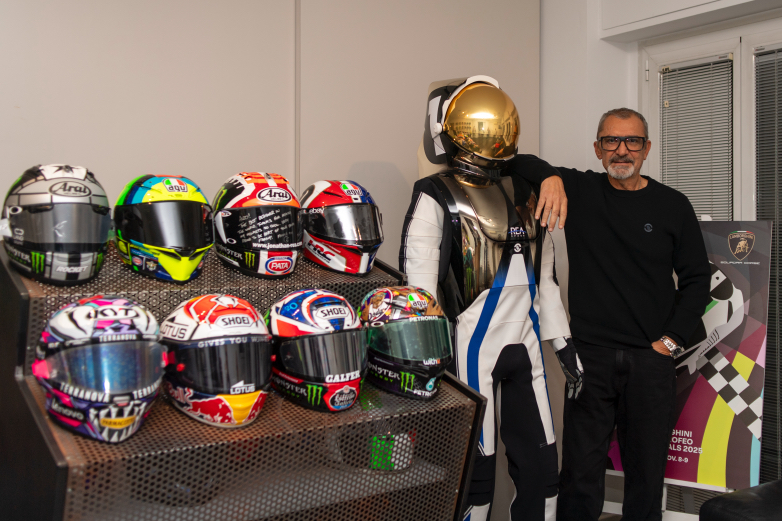 Ο Drudi δίπλα στη στολή του αστροναύτη και στα κράνη πολλών οδηγών που έχει σχεδιάσει, μεταξύ των οποίων και ο Marc Marquez