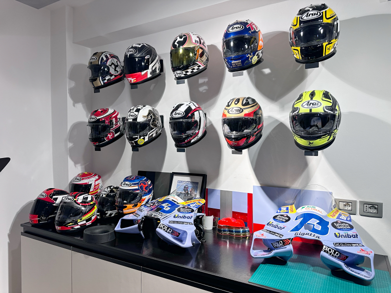 Μερικά από τα κράνη παραγωγής της Arai που φέρουν το δακτυλικό του αποτύπωμα και τα φέρνγκ της Gresini Racing