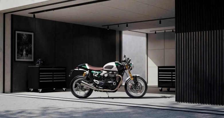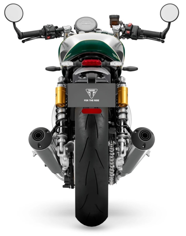 Σύμφωνα με την Triumph, η νέα Cafe Racer Edition είναι “τέχνη εν κινήσει”, κάτι που φαίνεται απλώς κοιτώντας τις φωτογραφίες, οπότε σίγουρα θα είναι ακόμη πιο εντυπωσιακή από κοντά, ειδικά όταν κινείται. Η εξωτερική εμφάνιση περιλαμβάνει χαμηλά τιμόνια clip-on, ένα νέο πίσω κάλυμμα που κρύβει τη σέλα του συνεπιβάτη και πιο αεροδυναμικό σχήμα. Υπάρχουν επίσης καθρέφτες στα άκρα του τιμονιού, αποκλειστικός χρωματισμός Competition Green και Aluminium Silver, πινελιές από γυαλιστερό αλουμίνιο παντού, το γραφικό νούμερο “12” στα πλαϊνά και μια χρυσή γραμμή Empire Gold που διατρέχει τη μοτοσυκλέτα, χωρίζοντας τα χρώματα. Για όσους θέλουν να κινούνται και με συνεπιβάτη, η Triumph αναφέρει ότι τα σχετικά εξαρτήματα θα περιλαμβάνονται στο κιβώτιο παραλαβής, ώστε οι ιδιοκτήτες να μπορούν να αντικαταστήσουν το πίσω μέρος της σέλας όποτε το επιθυμούν.