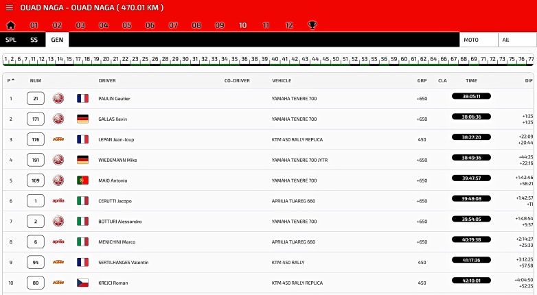 Αποδεικνύοντας την κυριαρχία των Ténéré απέναντι στους μονοκύλινδρους αντιπάλους των 450 κ.εκ., όχι μόνο «κλείδωσαν» την πρώτη πεντάδα της Ειδικής, αλλά με τους Paulin και Gallas 1ο και 2ο αντίστοιχα, και τους Wiedemann 4ο, Maio 5ο και Botturi 7ο στη γενική κατάταξη, υπάρχουν 5 αναβάτες μέσα στους 7 πρώτους συνολικά. Παράλληλα, κατέχουν τις θέσεις 1-2-3-4 στην κατηγορία +650 κ.εκ.