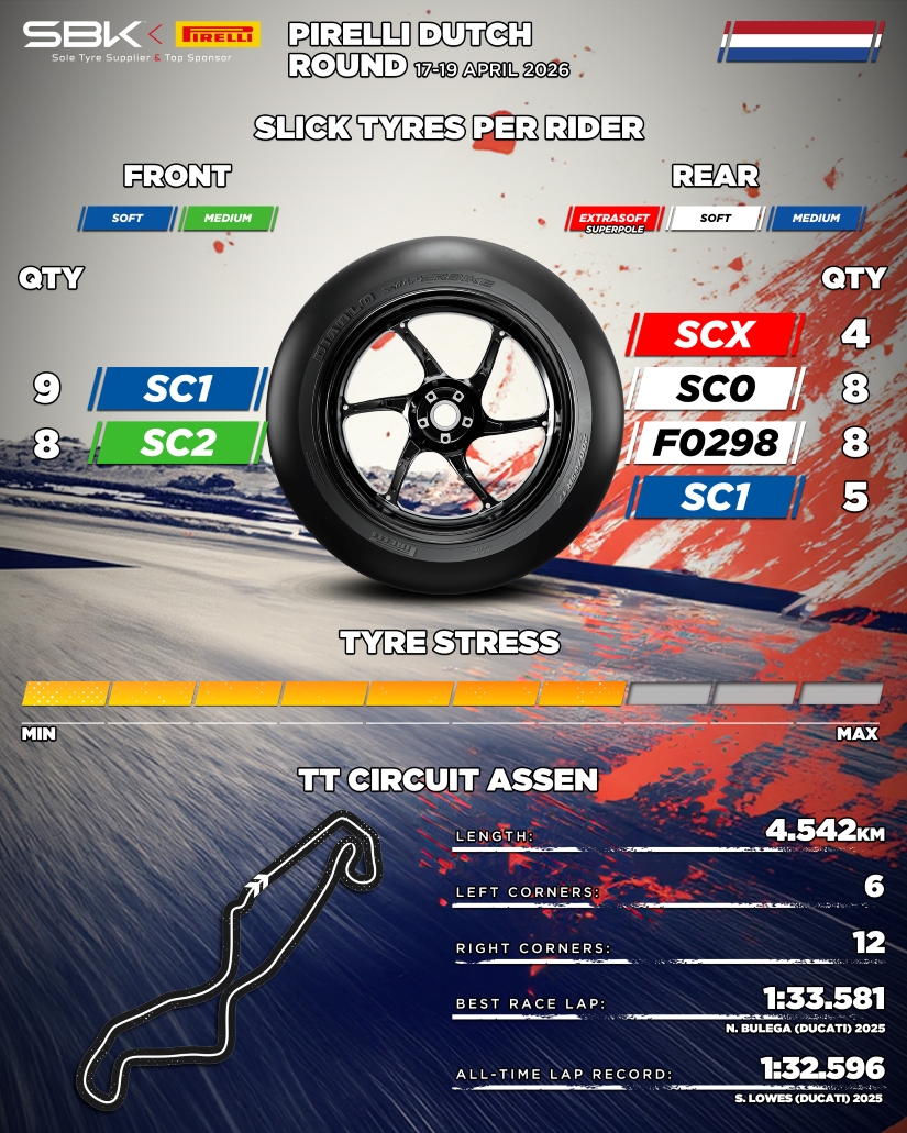 "Με τον Ολλανδικό Γύρο Pirelli του WorldSBK 2026, το Πρωτάθλημα φτάνει στο TT Circuit Assen, μια από τις πιο εμβληματικές πίστες στον κόσμο της μοτοσικλέτας. Γρήγορο και τεχνικό, το Assen διαθέτει ένα μείγμα στροφών χαμηλής, μέσης και υψηλής ταχύτητας, καθώς και συχνά μεταβλητές καιρικές συνθήκες, οι οποίες με την πάροδο των ετών έχουν παίξει καθοριστικό ρόλο στα αποτελέσματα των αγώνων. Για τον τρίτο γύρο, επιβεβαιώνοντας μια συνεχή προσπάθεια ανάπτυξης που στοχεύει στη βελτίωση τόσο της απόλυτης απόδοσηςστον γύρο όσο και στην περαιτέρω αύξηση της αντοχής και της συνέπειας της απόδοσης σε όλη την διάρκεια του αγώνα, η Pirelli παρέχει σε ομάδες και αναβάτες ένα νέο ελαστικό ανάπτυξης, το F0298, με μαλακή γόμα για τον πίσω τροχό. Αυτό το ελαστικό θα μπορούσε να αποτελέσει μια καλή εναλλακτική λύση στο τυπικό SC0, με στόχο τη βελτίωση της σταθερότητας, εξασφαλίζοντας παράλληλα υψηλό επίπεδο συνέπειας στις συνθήκες του αγώνα. Λαμβάνοντας υπόψη τα χαρακτηριστικά της πίστας και τις πιθανώς χαμηλές θερμοκρασίες, η επιλογή μας για τις κατατακτήριες και τον αγώνα Superpole είναι το supersoft SCX, το οποίο μέχρι την περασμένη σεζόν ήταν γνωστό ως ελαστικό ανάπτυξης E0126 και έχει γίνει μέρος της στάνταρ γκάμας φέτος. Για τον ίδιο λόγο, ως εναλλακτική λύση στις στάνταρ και τις επιλογές ανάπτυξης μαλακών ελαστικών, οι αναβάτες θα μπορούν επίσης να βασίζονται στο μεσαίο πίσω ελαστικό SC1 σε περίπτωση χαμηλών θερμοκρασιών.''